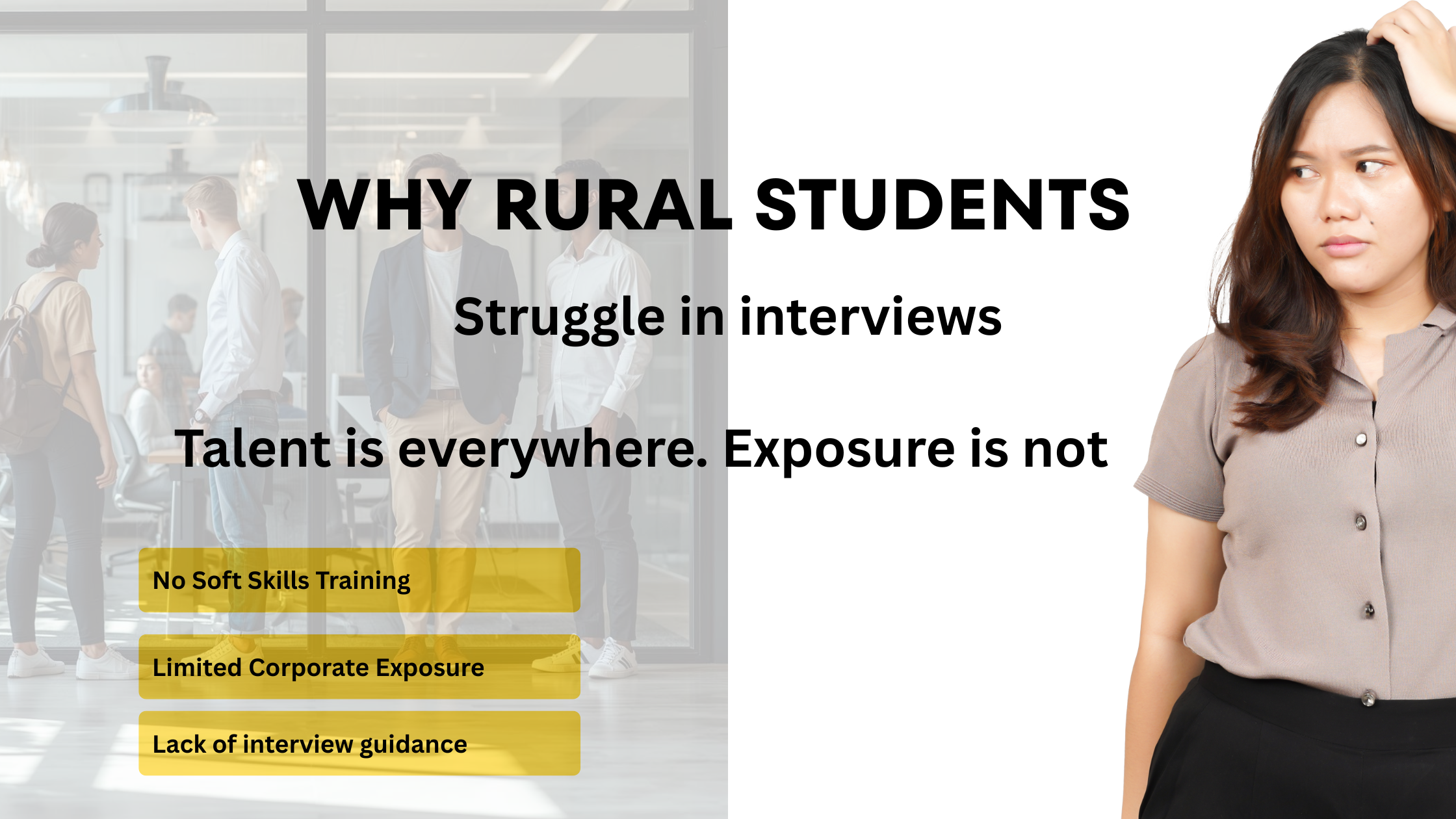 Stop interview rejections. Start getting hired. Our 4-module program teaches confidence building, business communication, interview mastery, and corporate etiquette to rural Tamil Nadu graduates. Led by IIM-trained coach with 20+ years recruiting experience.